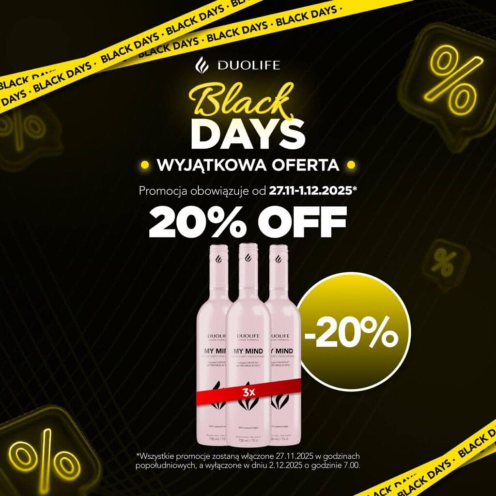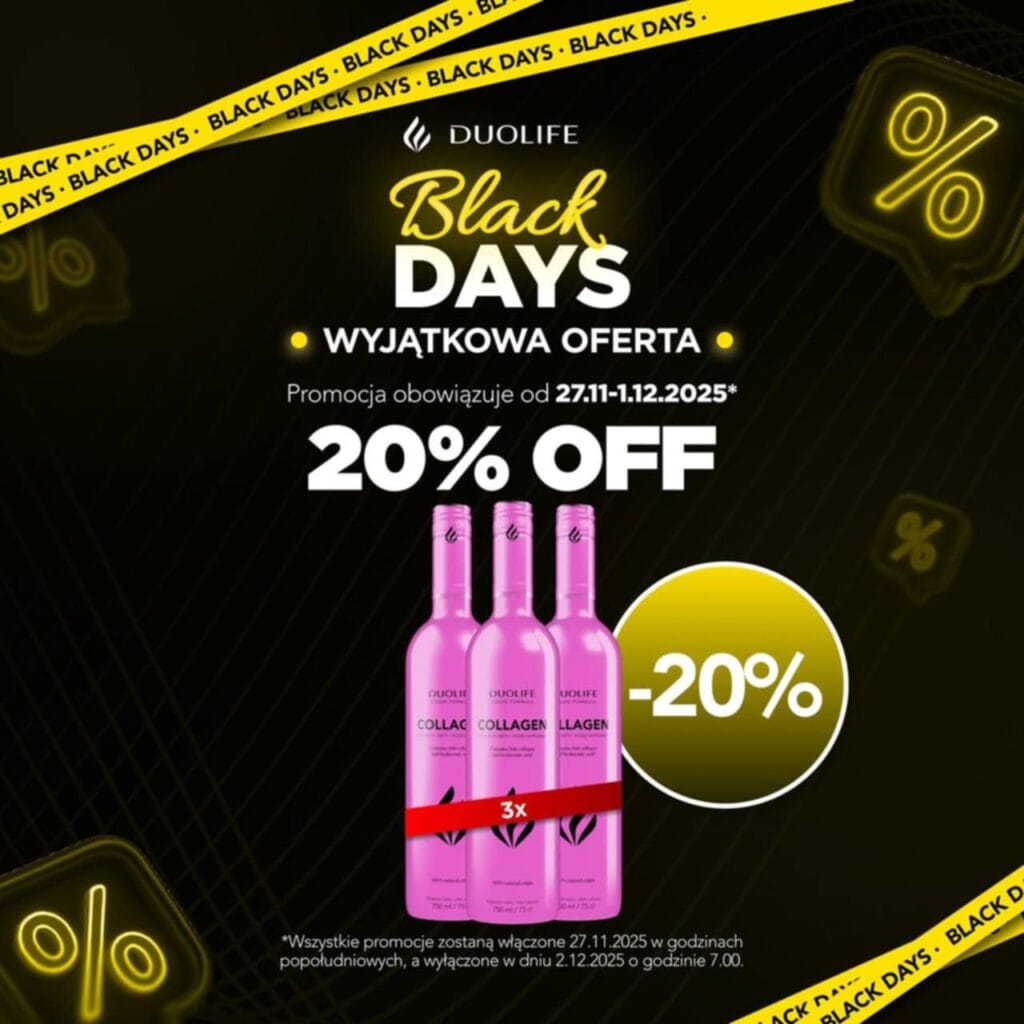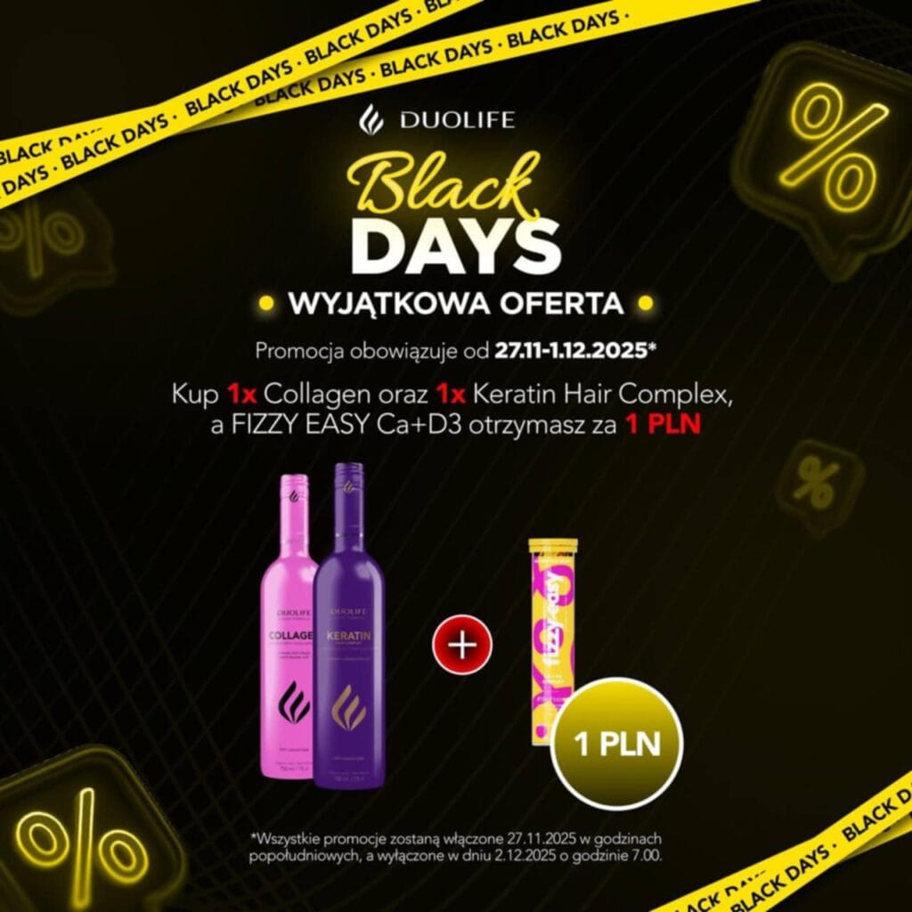 Black Week w DuoLife to idealny moment, by zadbać o zdrowie, uzupełnić zapasy suplementów i przetestować produkty, które od dawna masz w planach. Tegoroczne promocje są wyjątkowo atrakcyjne — zniżki naliczane są automatycznie, więc kod rabatowy nie będzie Ci potrzebny.